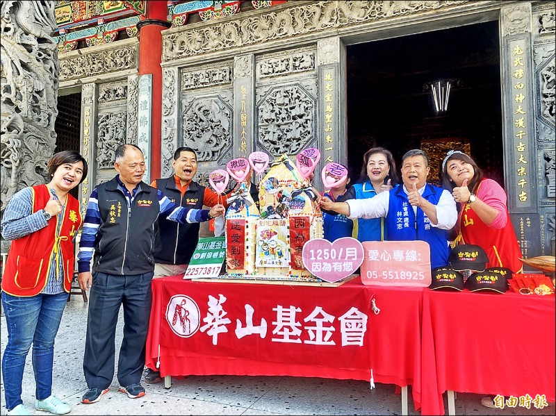 斗六南聖宮廟方人員昨以南聖宮名義捐助華山基金會十萬元,華山基金會表示,愛心年菜每份七百元、孤老服務費每人每月一千二百五十元。